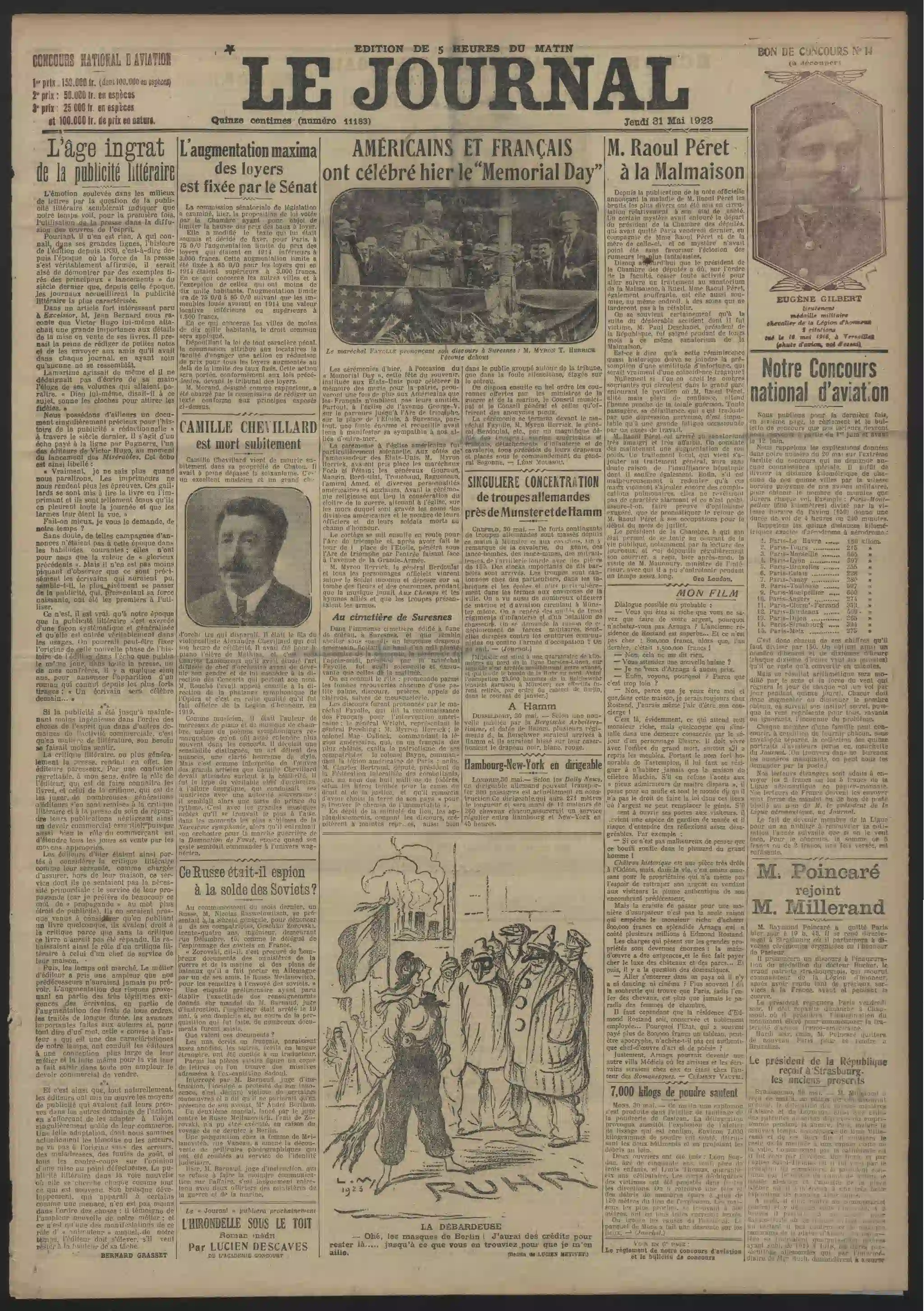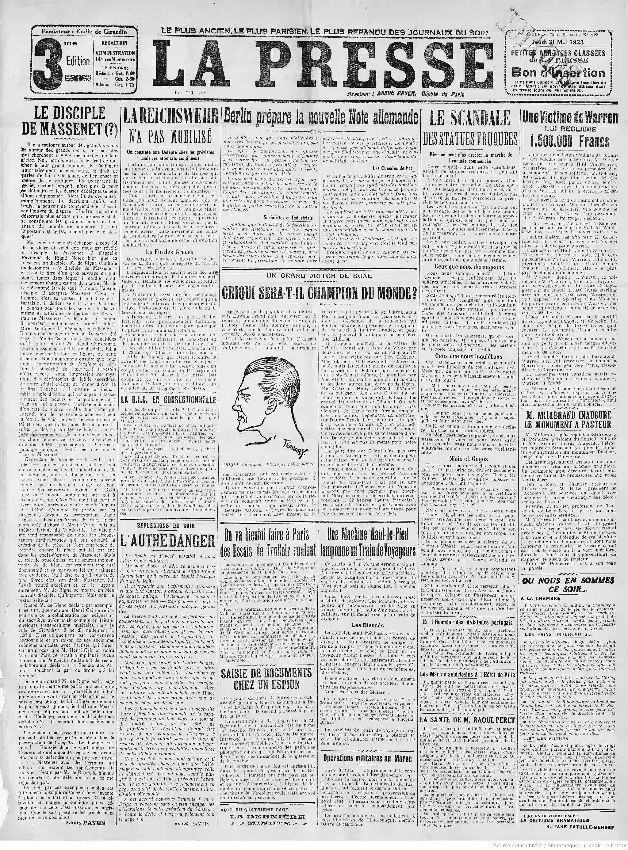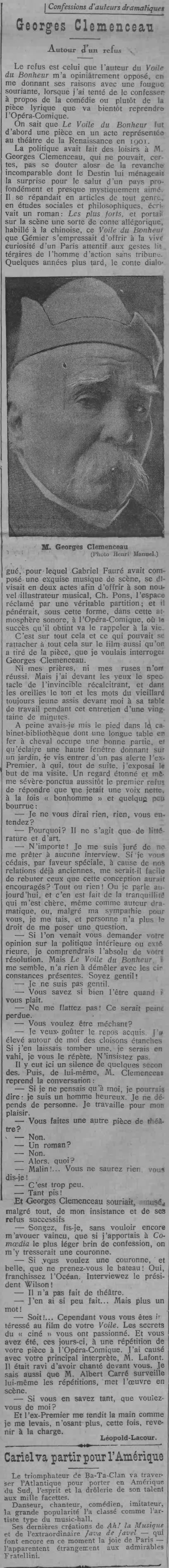 Page une - Georges Clémenceau et le refus qu'il oppose aux demandes d'interview |