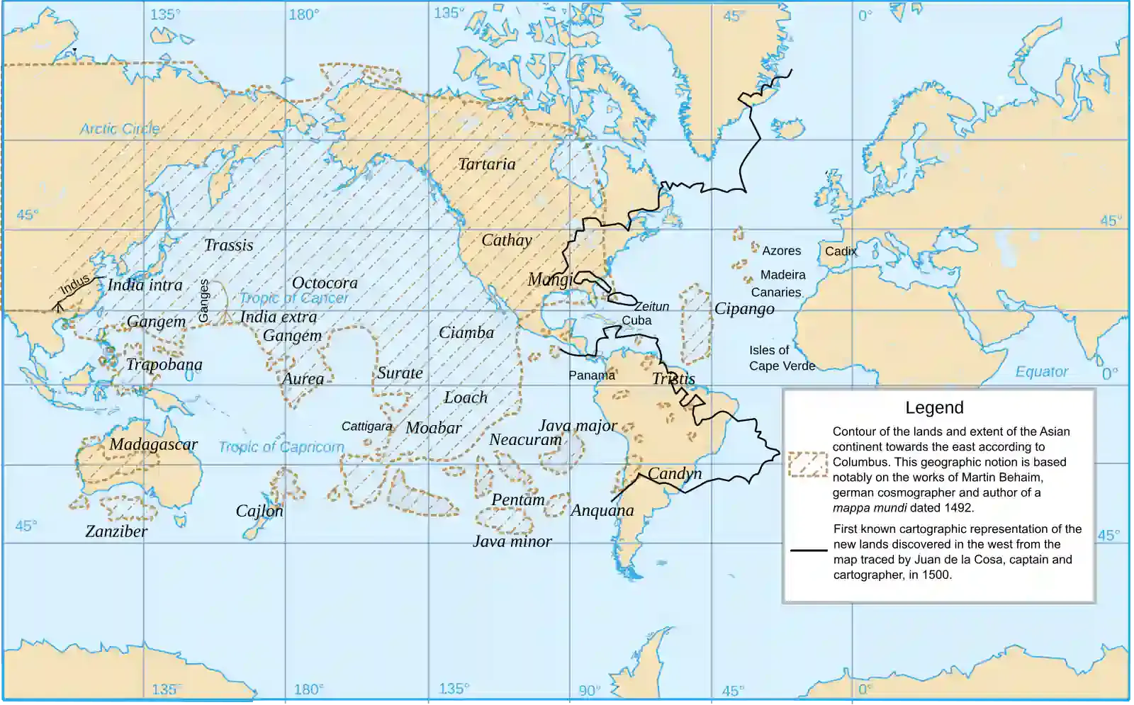 À Nurembergle 20 juin 1492, soit quelques semaines avant la découverte du Nouveau Monde par les Européens, le cartographe et navigateur Martin Behaïm achève la réalisation du premier globe terrestre... Ce globe, d'un diamètre d'environ 50 centimètres, est aujourd'hui conservé dans sa ville natale |