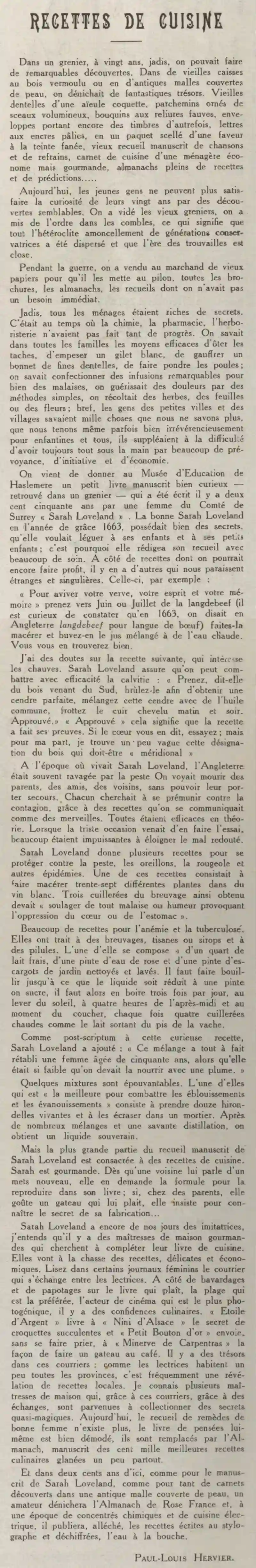 The Haslemere Education Museum has just been given a curious little handwritten book found in an attic which was written two hundred and fifty years ago by a woman from the County of Surrey, “Sarah Loveland”. The good Sarah Loveland in the year of our Lord 1663, possessed many secrets. that she wanted to leave to her children and grandchildren; this is why she wrote her collection with great care. Alongside recipes from which we could still benefit, there are others which seem strange and singular to us. This, for example: "To sharpen your verve, your spirit and your memory" take langdebeef around June or July (it is curious to note that in 1663, it was said in England langdebeef for beef tongue) macerate it and drink the juice mixed with hot water. You will find yourself well off. I have doubts about the following recipe, which interests bald people. Sarah Loveland assures us that baldness can be effectively combated: “Take wood from the South, burn it to obtain a perfect ash, mix this ash with common oil, rub the scalp morning and evening. Approved." “Approved” means that the recipe has proven itself. If you feel like it, try it; but for my part, I find this designation of the wood which must be “southern” a little vague. At the time when Sarah Loveland lived, England was often ravaged by the plague. We saw relatives, friends, neighbors die, without being able to help them. Everyone sought to protect themselves against contagion, thanks to recipes that were shared like wonders. All were effective in theory. When the sad opportunity came to try it, many were powerless to ward off the dreaded evil. Sarah Loveland gives several recipes to protect against the plague, mumps, measles and other epidemics. One of these recipes involved macerating thirty-seven different plants in white wine. Three spoonfuls of the beverage thus obtained were to “relieve any discomfort or mood causing oppression of the heart or stomach”. Lots of recipes for anemia and tuberculosis. They relate to beverages, herbal teas or syrups and pills. One of them consists of “a quart of fresh milk, a pint of rose water and a pint of cleaned and washed garden snails. It is necessary to boil until the liquid is reduced to a pint, it is sweetened, it must then be drunk three times a day, at sunrise, at four o'clock in the afternoon and at bedtime, each time four spoonfuls hot like the milk coming out of the cow's udder. As a postscript to this curious recipe, Sarah Loveland added: “This mixture completely restored a woman aged fifty, when she was so weak that she had to be fed with a feather. » Some mixtures are terrible. One of them which is "best for combating dazzling and fainting" consists of taking twelve live swallows and crushing them in a mortar. After numerous mixings and skilful distillation, we obtain a sovereign liquid. But the majority of Sarah Loveland's manuscript collection is devoted to cooking recipes. Sarah is greedy. As soon as a neighbor tells her about a new dish, she asks for the formula so that she can reproduce it in her book; if, at a relative's house, she tastes a cake she likes, she insists on knowing the secret of how it is made... Sarah Loveland still has imitators today, I hear that there are gourmet housewives who are looking to complete their cookbook. They go hunting for delicate and economical recipes. Read the letters exchanged between readers in certain women's newspapers. Alongside chatter and chatter about which book you like, which beach is your favorite, which movie actor is the most photogenic, there are culinary secrets. “Etoile d'Argent” delivers to “Nini d'Alsace” the secret of succulent croquettes and “Petit Bouton d'or” sends, without being asked, to “Minerve de Carpentras” the way to make a coffee cake. There are treasures. in these letters: as the readers live in almost all the provinces, it is frequently a revelation of local recipes. I know several housewives who, thanks to these letters, thanks to exchanges, managed to collect secrets. quasi-magical. Today, the collection of good woman's remedies no longer exists, the book of thoughts itself is very out of fashion, they are replaced by the Almanac, a manuscript of the hundred thousand best recipes. culinary treats gleaned from everywhere. And in two hundred years from now, as with Sarah Loveland's manuscript, as with so many notebooks discovered in an ancient trunk covered with skin, an amateur will unearth Rose France's Almanac and, in an era of chemical concentrates and electric kitchen, he will publish, excitedly, the recipes written in pen and deciphered, with mouth watering.