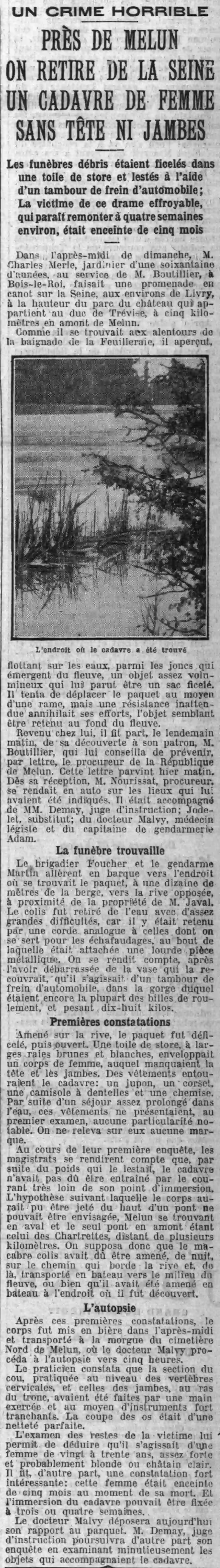 The funeral remains were tied up in awning fabric and weighted down with an automobile brake drum; The victim of this terrible tragedy, which appears to date back about four weeks, was five months pregnant On Sunday afternoon, Mr. Charles Merle, a gardener in his sixties, in the service of Mr. Boutillier, Bois-le-Roi, was taking a canoe trip on the Seine, near Livry, at the height of the castle park which belongs to the Duke of Treviso, five kilometers upstream from Melun. As he was near the swimming pool of the Feuilleraie, he saw, floating on the waters, among the rushes emerging from the river, a rather large object which appeared to him to be a tied bag. He attempted to move the package using an oar, but unexpected resistance annihilated his efforts, the object appearing to be held at the bottom of the river. Returning home, the next morning he reported his discovery to his boss, Mr. Boutillier, who advised him to notify, by letter, the public prosecutor of Melun. This letter arrived yesterday morning. As soon as he received it, Mr. Nourissat, prosecutor, went by car to the places which had been indicated to him. He was accompanied by MM. Demay, investigating judge; Jodelet, substitute; Doctor Malvy, forensic pathologist and gendarmerie captain Adam.