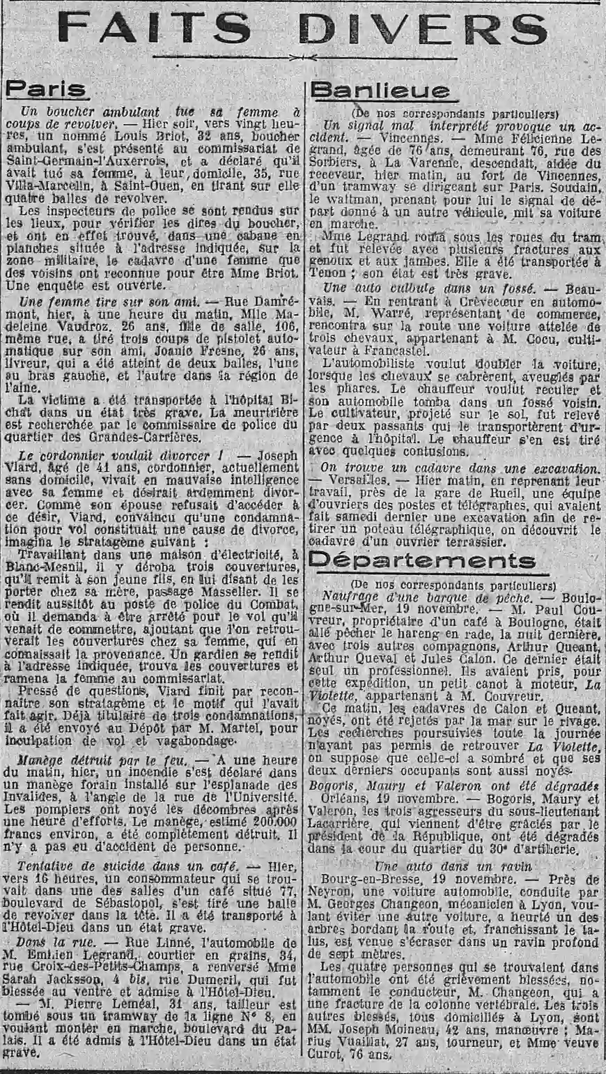 Departments (From our private correspondents) Sinking of a fishing boat. Boulogne-sur-Mer, November 19. Mr. Paul Couvreur, owner of a café in Boulogne, went fishing for herring in the harbor last night with three other companions, Arthur Queant, Arthur Queval and Jules Calon. The latter was alone a professional. For this expedition, they took a small motorboat, La Violette, belonging to Mr. Couvreur. This morning, the bodies of Calon and Queant, drowned, were washed ashore by the tide. The searches continued all day having failed to find La Violette, it is assumed that it sank and that its last two occupants were also drowned.