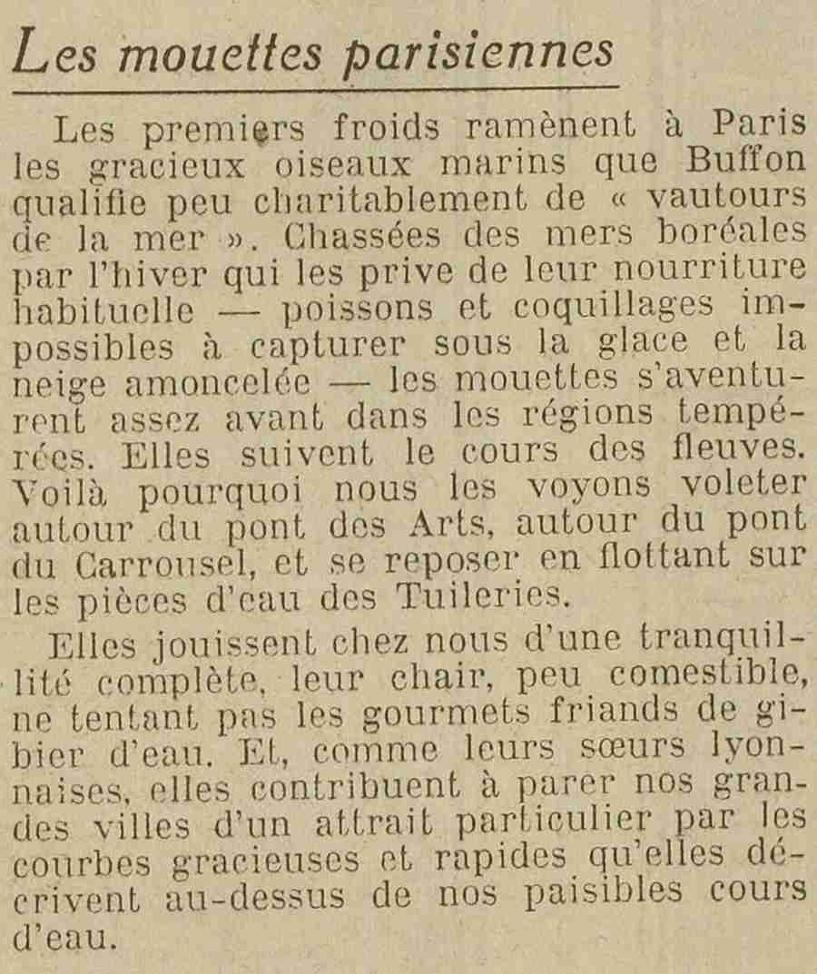 Les premiers froids ramènent à Paris les gracieux oiseaux marins que Buffon qualifie peu charitablement de «vautours de la mer». Chassées des mers boréales par l'hiver qui les prive de leur nourriture habituelle poissons et coquillages impossibles à capturer sous la glace et la neige amoncelée les mouettes s'aventurent assez avant dans les régions tempérées. Elles suivent le cours des fleuves. Voilà pourquoi nous les voyons voleter autour du pont des Arts, autour du pont du Carrousel, et se reposer en flottant sur les pièces d'eau des Tuileries.