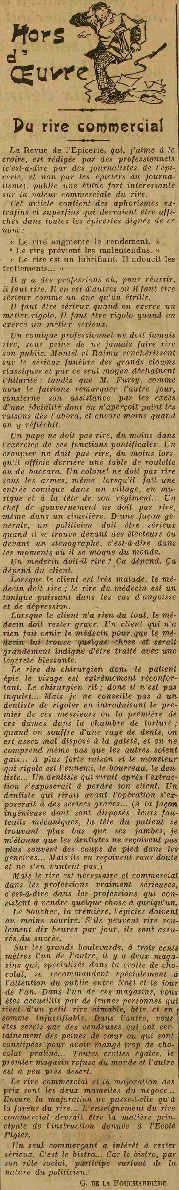 Cet article contient des aphorismes extrafins et superfins qui devraient être affichés dans toutes les épiceries dignes de ce nom: « Le rire augmente le rendement. « Le rire prévient les malentendus. « Le rire est un lubrifiant. Il adoucit les frottements... Il y a des professions où, pour réussir, il faut rire. Il en est d'autres où il faut être sérieux comme un âne qu'on étrille. Il faut être sérieux quand on exerce un métier rigolo. Il faut être rigolo quand on exerce un métier sérieux. Un comique professionnel ne doit jamais rire, sous peine de ne jamais faire rire son public. Montel et Raimu renchérissent sur le sérieux funèbre des grands clowns classiques et par ce seul moyen déchaînent l'hilarité; tandis que M. Fursy, comme nous le faisions remarquer l'autre jour, consterne son assistance par les excès. d'une jovialité dont on n'aperçoit point les raisons dès l'abord, et encore moins quand on y réfléchit. Un pape ne doit pas rire, du moins dans l'exercice de ses fonctions pontificales. Un croupier ne doit pas rire, du moins lorsqu'il officie derrière une table de roulette ou de baccara. Un colonel ne doit pas rire sous les armes, même lorsqu'il fait une entrée comique dans un village, en musique et à la tête de son régiment... Un chef de gouvernement ne doit pas rire, même dans un cimetière. D'une façon générale, un politicien doit être sérieux quand il se trouve devant des électeurs ou devant un sténographe, c'est-à-dire dans les moments où il se moque du monde. Un médecin doit-il rire? Ça dépend. Ça dépend du client. Lorsque le client est très malade, le médecin doit rire; le rire du médecin est un tonique puissant dans les cas d'angoisse et de dépression. Lorsque le client n'a rien du tout, le médecin doit rester grave. Un client qui n'a rien fait venir le médecin pour que le médecin lui trouve quelque chose et serait grandement indigne d'être traité avec une légèreté blessante. Le rire du chirurgien dont le patient épie le visage est extrêmement réconfortant. Le chirurgien rit; donc il n'est pas inquiet... Mais je ne conseille pas à un dentiste de rigoler en introduisant le premier de ces messieurs ou la première de ces dames dans la chambre de torture; quand on souffre d'une rage de dents, on est assez mal disposé à la gaieté, et on ne comprend même pas que les autres soient gais... A plus forte raison si le monsieur qui rigole est l'ennemi, le bourreau, le dentiste... Un dentiste qui rirait après l'extraction s'exposerait à perdre son client. Un dentiste qui rirait avant l'opération s'exposerait à des sévices graves... (A la façon ingénieuse dont sont disposés leurs fauteuils mécaniques, la tête du patient se trouvant plus bas que ses jambes, je m'étonne que les dentistes ne reçoivent pas plus souvent des coups de pied dans les gencives... Mais ils en reçoivent sans doute et ne s'en vantent pas.) Mais le rire est nécessaire et commercial dans les professions vraiment sérieuses, c'est-à-dire dans les professions qui consistent à vendre quelque chose à quelqu'un. Le boucher, la crémière, l'épicier doivent au moins sourire. S'ils peuvent rire seulement dix heures par jour, ils sont assurés du succès. Sur les grands boulevards, à trois cents mètres l'un de l'autre, il y a deux magasins qui, spécialisés dans la crotte de chocolat, se recommandent spécialement à l'attention du public entre Noël et le jour de l'an. Dans l'un de ces magasins, vous êtes accueillis par de jeunes personnes qui rient d'un petit rire aimable, bête et en somme injustifiable. Dans l'autre, vous êtes servis par des vendeuses qui ont certainement des peines de cœur ou qui sont constipées pour avoir mangé trop de chocolat praliné... Toutes crottes égales, le premier magasin refuse du monde et l'autre est à peu près désert. Le rire commercial et la majoration des prix sont les deux mamelles du négoce... Encore la majoration ne passe-t-elle qu'à la faveur du rire... L'enseignement du rire commercial devrait être la matière principale de l'instruction donnée à l’École Pigier. Un seul commerçant a intérêt à rester sérieux. C'est le bistro... Car le bistro, par son rôle social, participe surtout de la nature du politicien. G. DE LA FOUCHARDIÈRE.