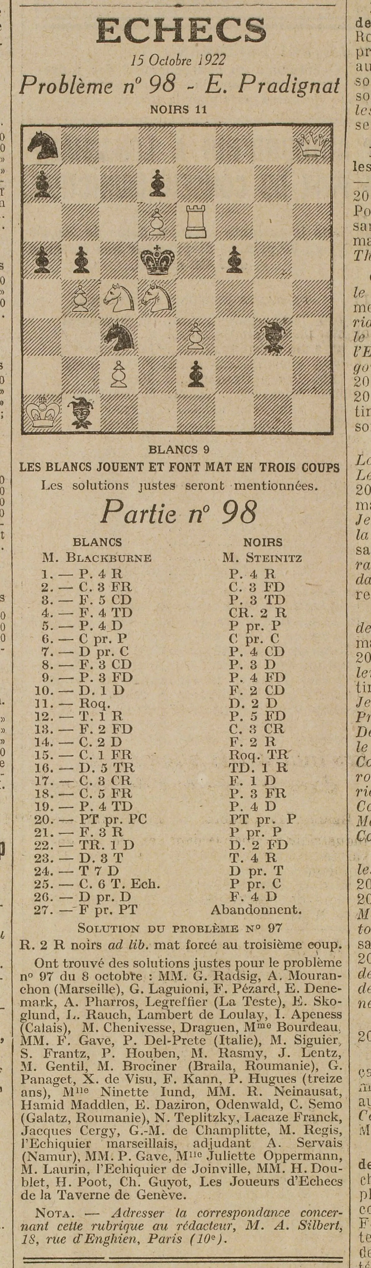 Et le problème d'échecs numéro 98 et la solution de la partie numéro 97 |