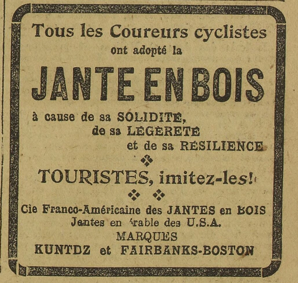 En page trois - une publicité pour les jantes préférées des coureurs cyclistes. Des jantes en bois, solidité, légèreté,résilience,en érable des USA |
